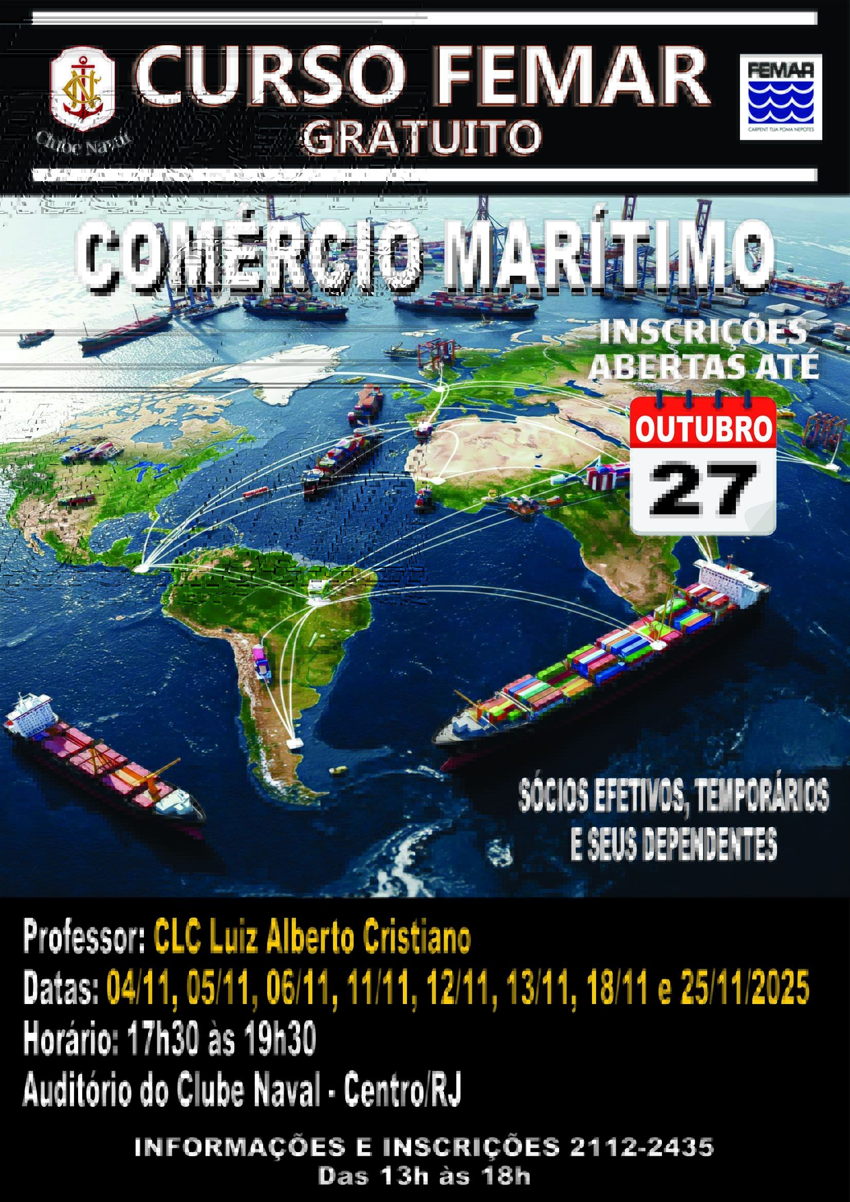 O curso de Comércio Marítimo para Sócios efetivos, temporários e seus dependentes está com as inscrições abertas até o dia 27/10/2025. Abaixo, seguem as informações pertinentes para fins de divulgação: